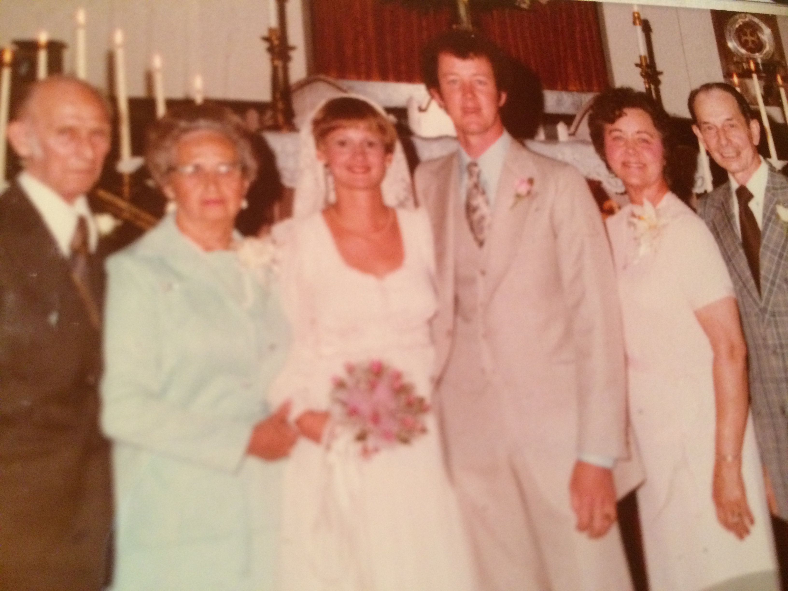 We had a wonderful and memorable wedding.  I wore a Gunne-Sax dress that I had purchased at Cumberland Mall in Atlanta for a whopping $40.  It was just the right dress and very much my style.  No frills!  Audrey Nolting crafted the perfect veil that hung softly down my shoulders.  I think the lace we used probably cost as much as my dress.  I wore the pearls my Daddy gave me when I was a child.  I felt like a princess.